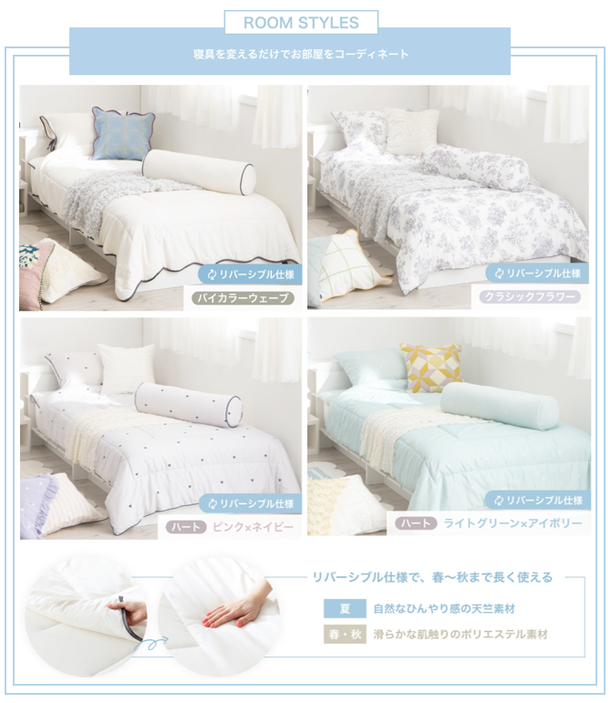 さらに今年は、夏の快適さはそのままに、春や秋にも心地よくご使用いただけるリバーシブル仕様が新登場!