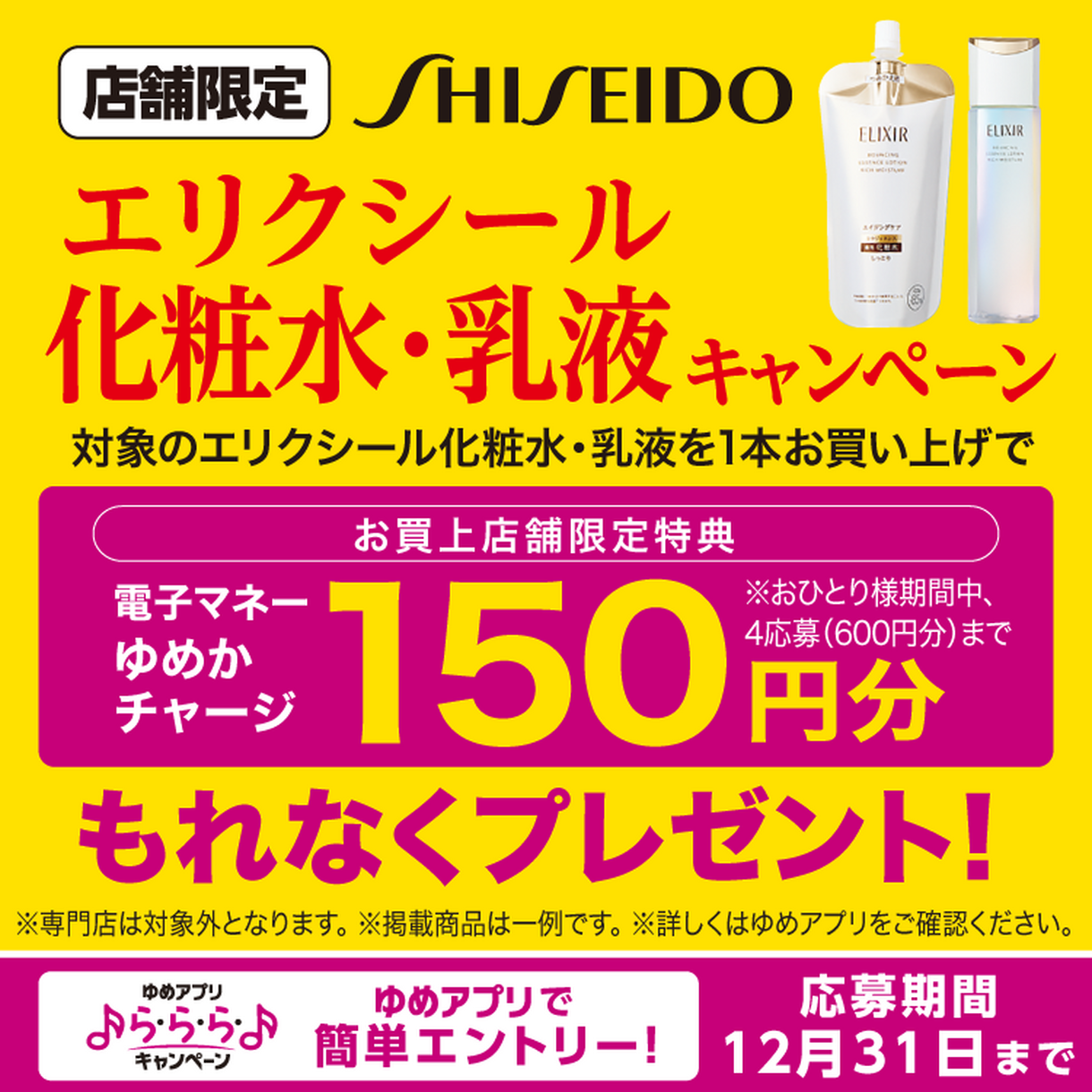 期間中、対象のエリクシール化粧水・乳液を1本お買い上げで、電子マネーゆめかチャージ150円分もれなくプレゼント!