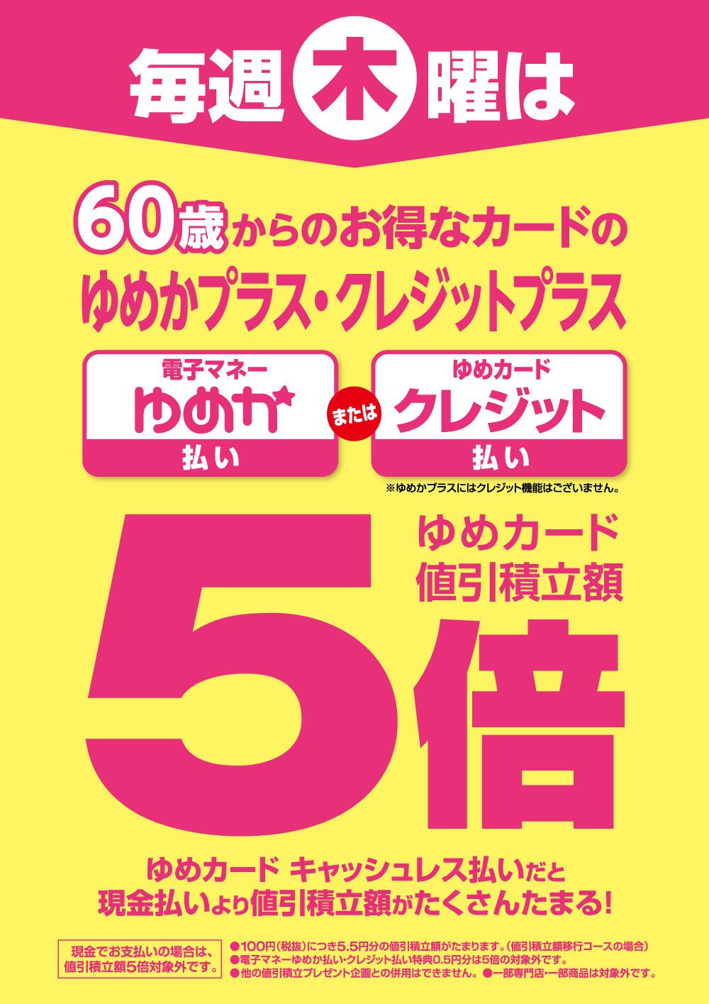 毎週木曜日は「ゆめかプラス・クレジットプラス」キャッシュレス払いがお得!