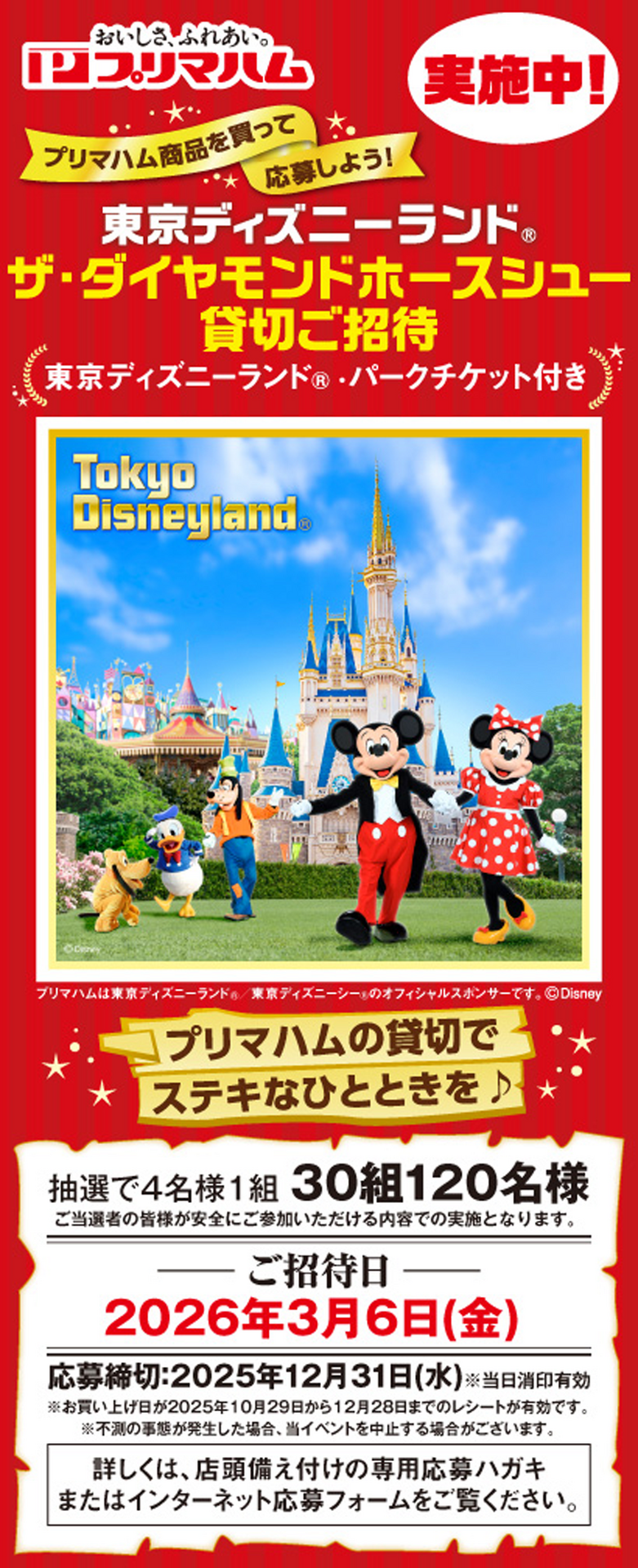 ゆめマート赤間 イベント/キャンペーン プリマハム商品を買って応募しよう!『東京ディズニーランド(R) ザ・ダイヤモンドホースシュー貸切ご招待!』