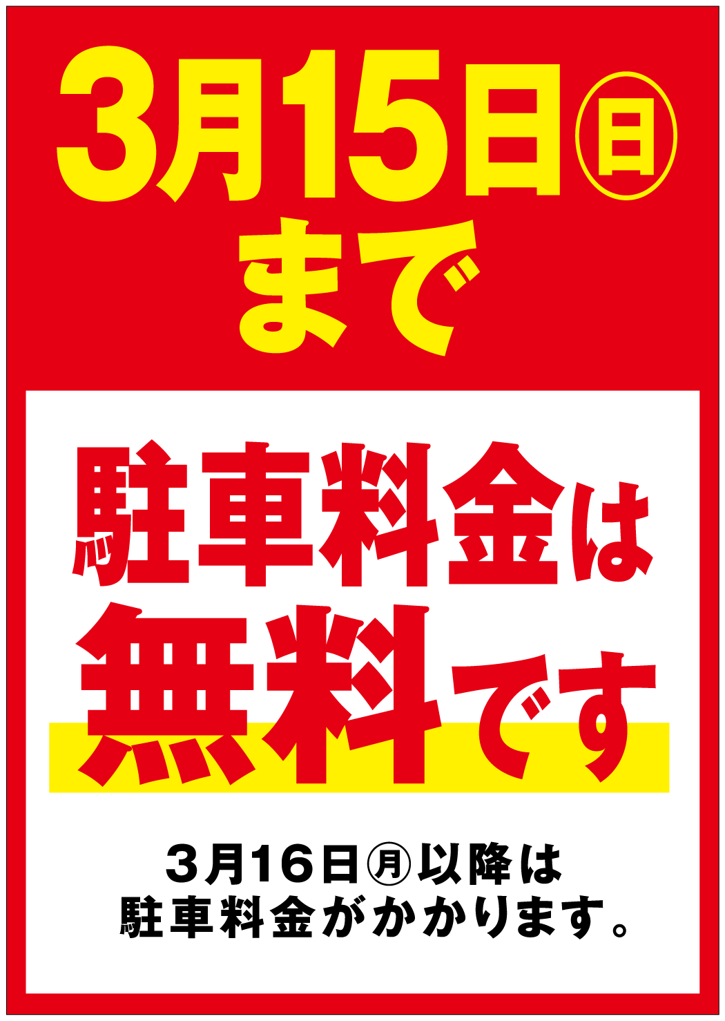 3月15日(日)まで、駐車料金は無料です。