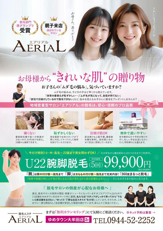 エアリアル大牟田店は、ゆめタウン内にある脱毛サロンということもあり、10代~70代までの幅広い年代の方にお越し頂いています。若い方だけでなく、40代以降で「もう歳だから」「この歳で脱毛なんか恥ずかしい」と思ってためらわれる方も、娘さんの「お母さんもキレイになれるから」という一言で、親子でお越し頂いている方も多くいらっしゃいます。 「いつまでも、キレイでいたい」「いつまでもキレイでいてほしい」そのお手伝いができればと思っております。 30代と40代のスタッフも在籍しておりますのでご不安な事があれば、何でもお答えさせて頂きます。 スタッフ一同心よりお待ちいたしております。