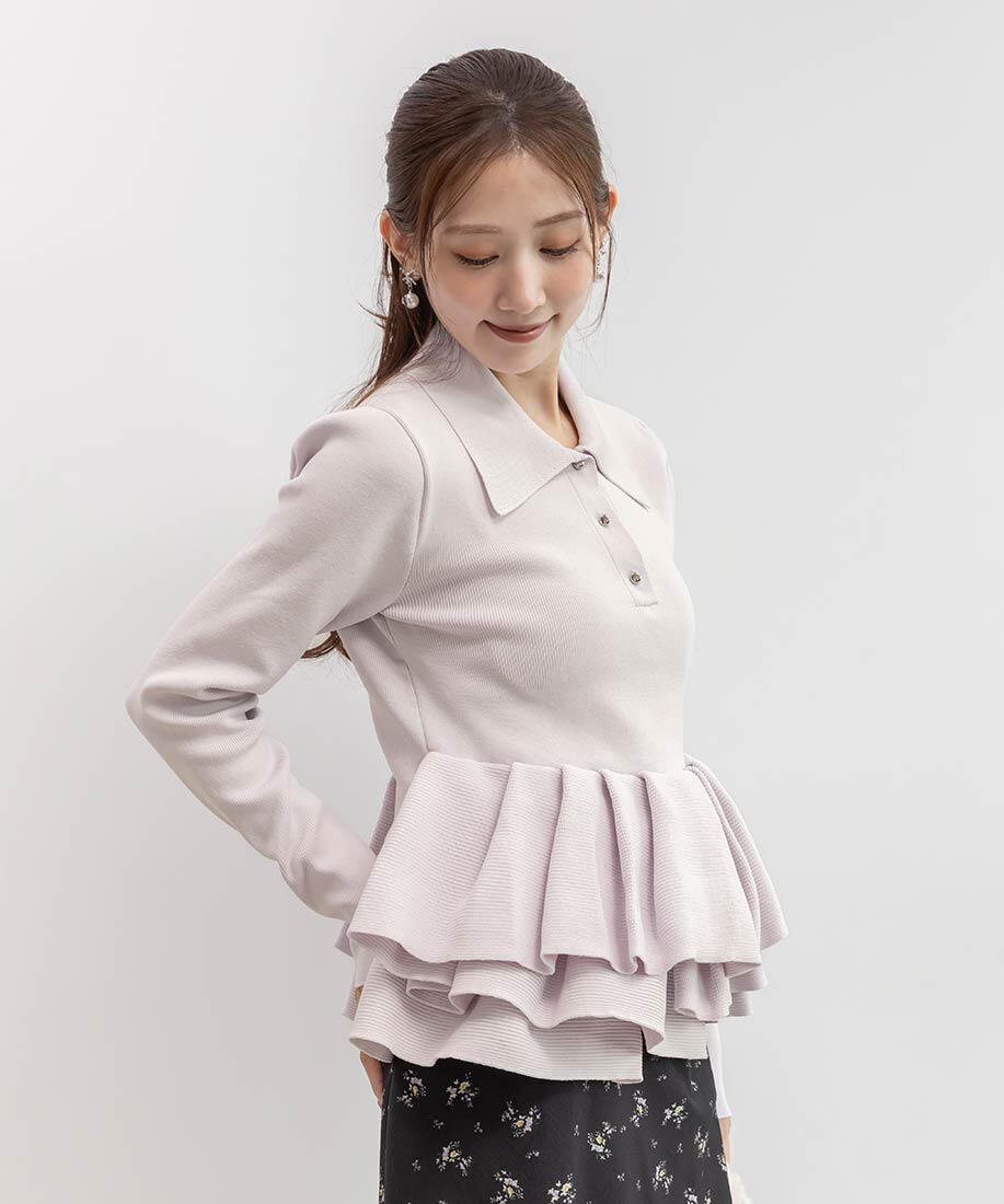 襟付きデザインとメタリックなボタンで上品に引き締めながら、タックを入れたペプラムで華やかさを演出してくれます♪