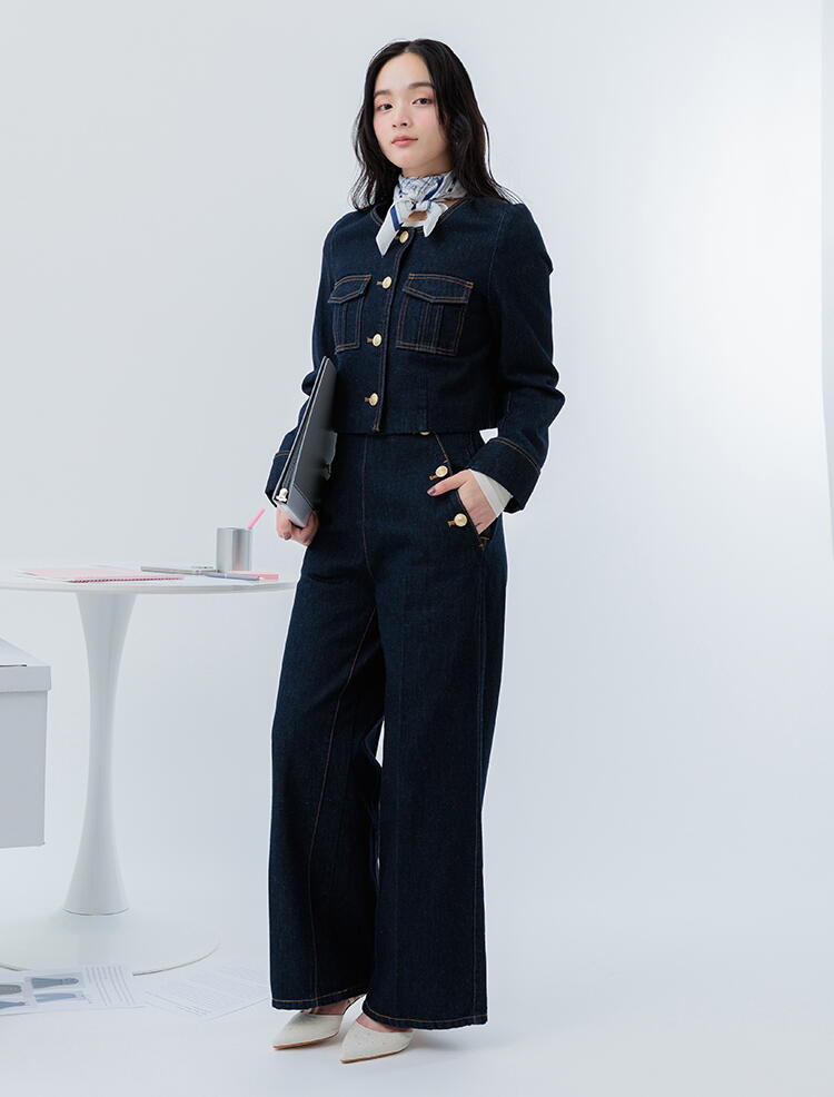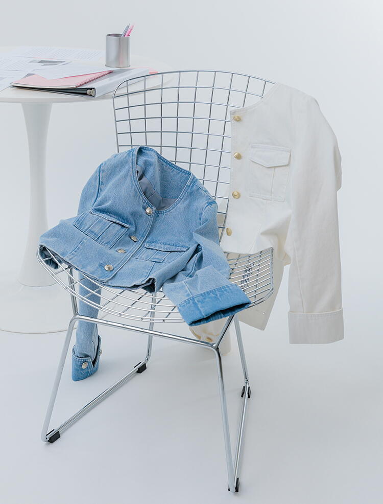 同素材のデニムパンツとセットで着用してトレンドスタイルも叶います。