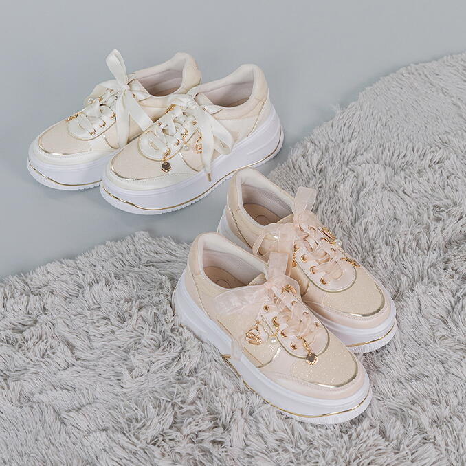 ハートコレクションオリジナルのモノグラムチャームとハートのカッティングが胸をときめかすボリュームソールスニーカー。