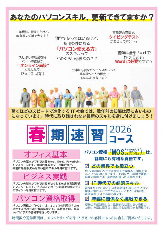 時間が取れるうちに勉強しておきたい、4月から新社会人になるのでパソコンスキルを身に着けておきたい!と「今後」への投資として始められる方も多いようです。