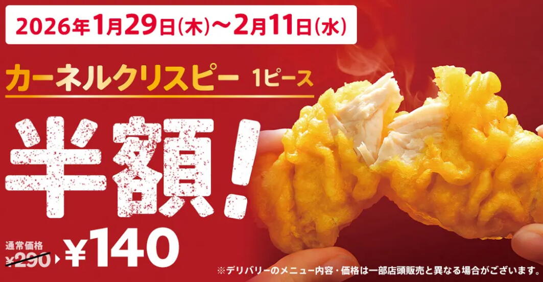 1998年の発売から今年で28(にわとり)周年を迎える「カーネルクリスピー」を、通常価格の“半額”でお楽しみいただける「カーネルクリスピー1ピース半額キャンペーン」を、2週間限定で実施します。