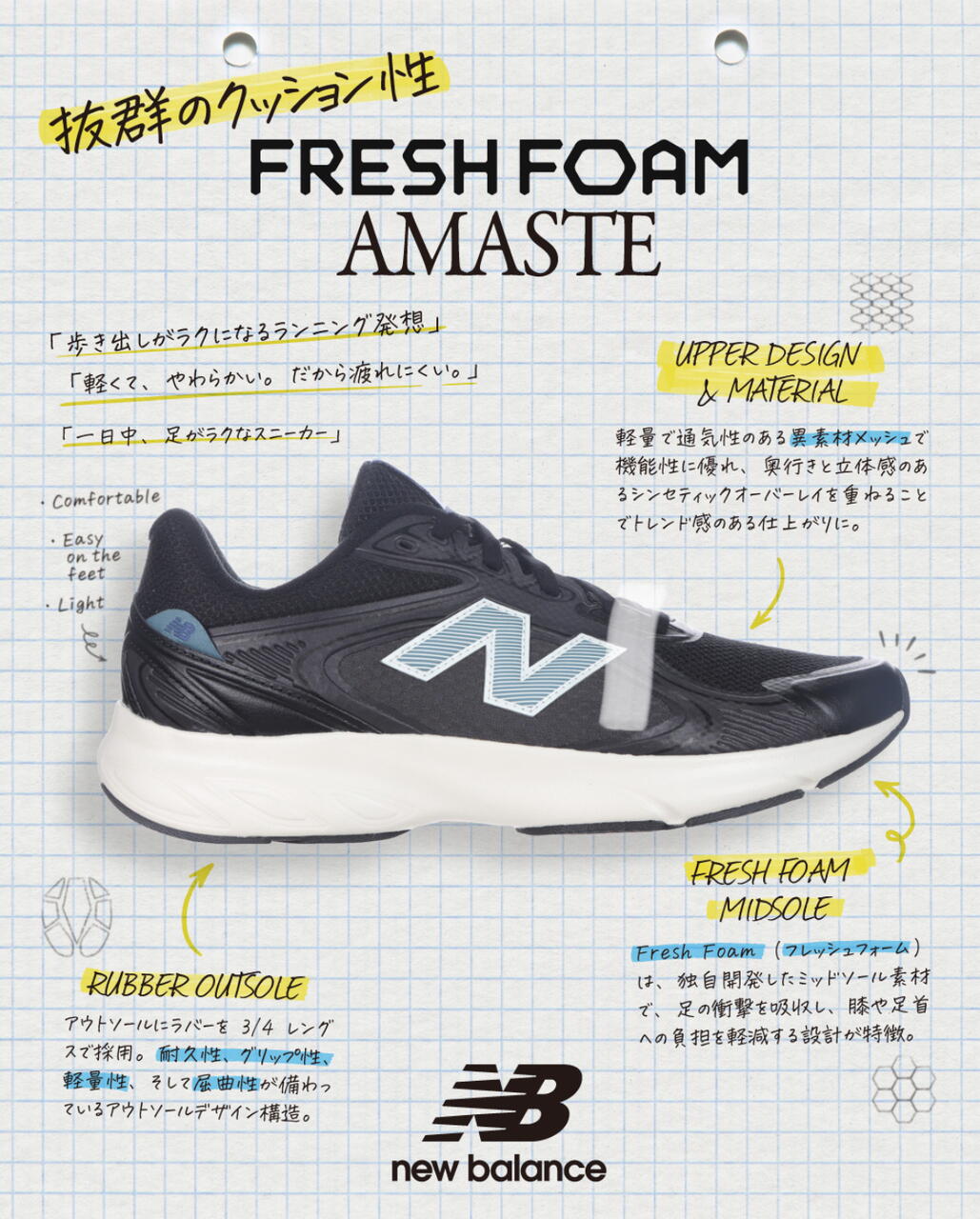 独自開発のFRESH FOAMミッドソールが衝撃を吸収し、膝や足首への負担を軽減。