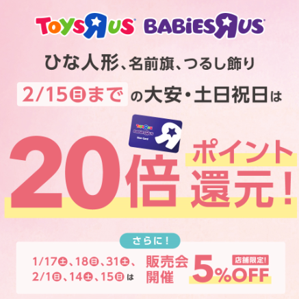 当日はひな人形全品・ひな名前旗 5%OFFとなり、更にトイザらスベビーザらスポイントカードのポイントが20倍!!