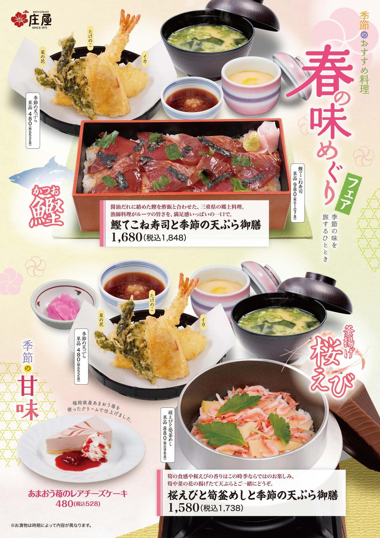 漁師料理がルーツの三重県の郷土料理「鰹てこね寿司」や春らしい風味と食感を味わえる「桜海老と筍の釜めし」を、菜の花や筍の「季節の天ぷら」と一緒にお楽しみください!あまおう苺のレアチーズケーキもおすすめです!この機会に是非ご賞味ください!