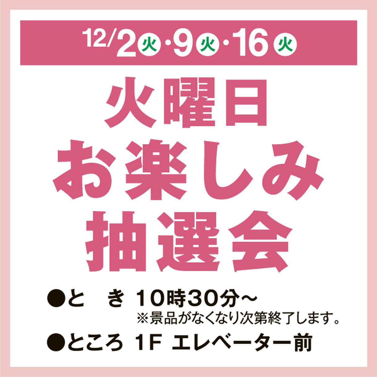 ※12/23(火)・30(火)の火曜日抽選会はお休みさせていただきます。 1月は1/6(火)から開催を予定しております。