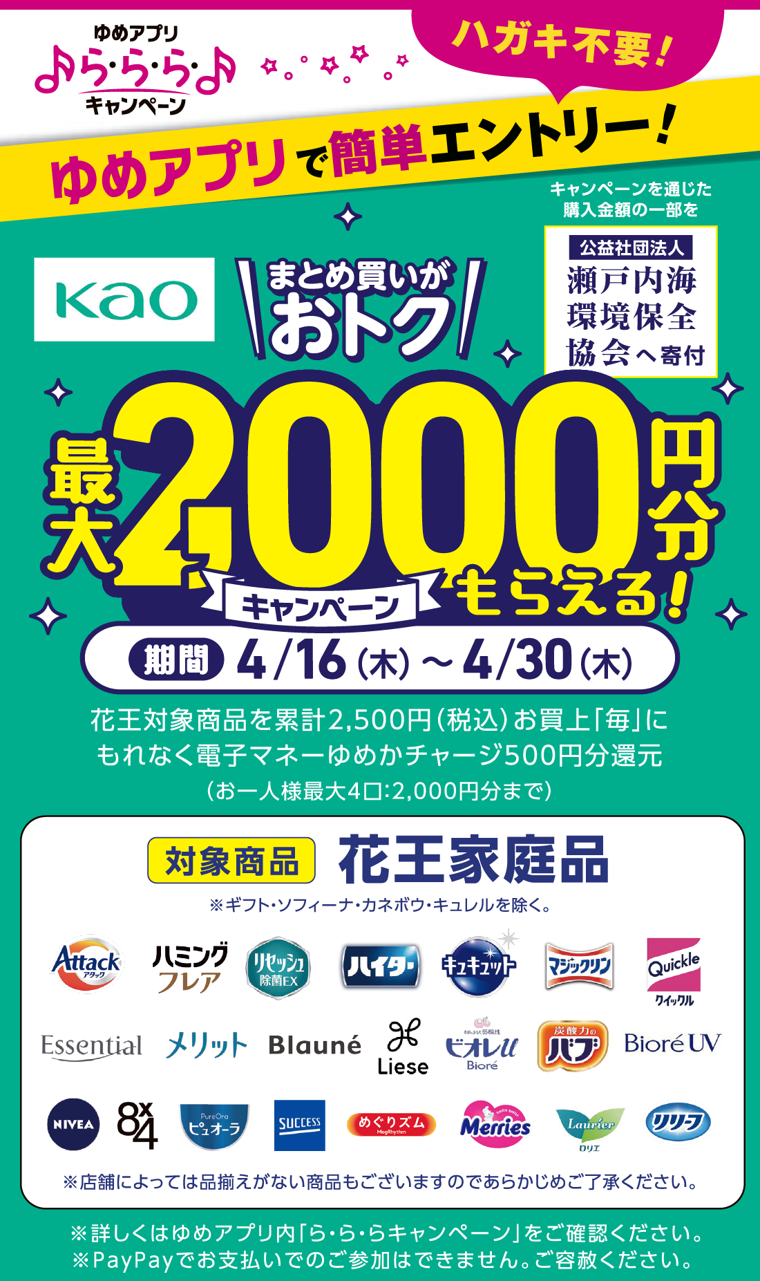 ゆめタウン高梁 イベント/キャンペーン 【ゆめアプリ ら・ら・ら・キャンペーン】花王『最大2,000円分もらえる!キャンペーン』