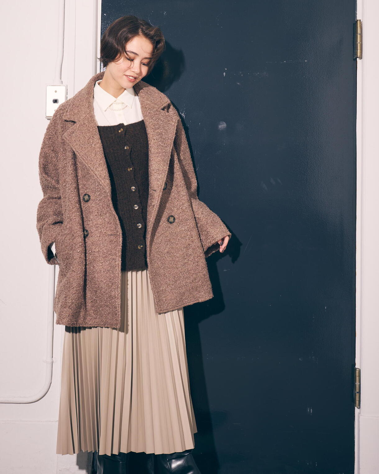 襟元を開いてPコート風の2通りのスタイルが楽しめるコートです。