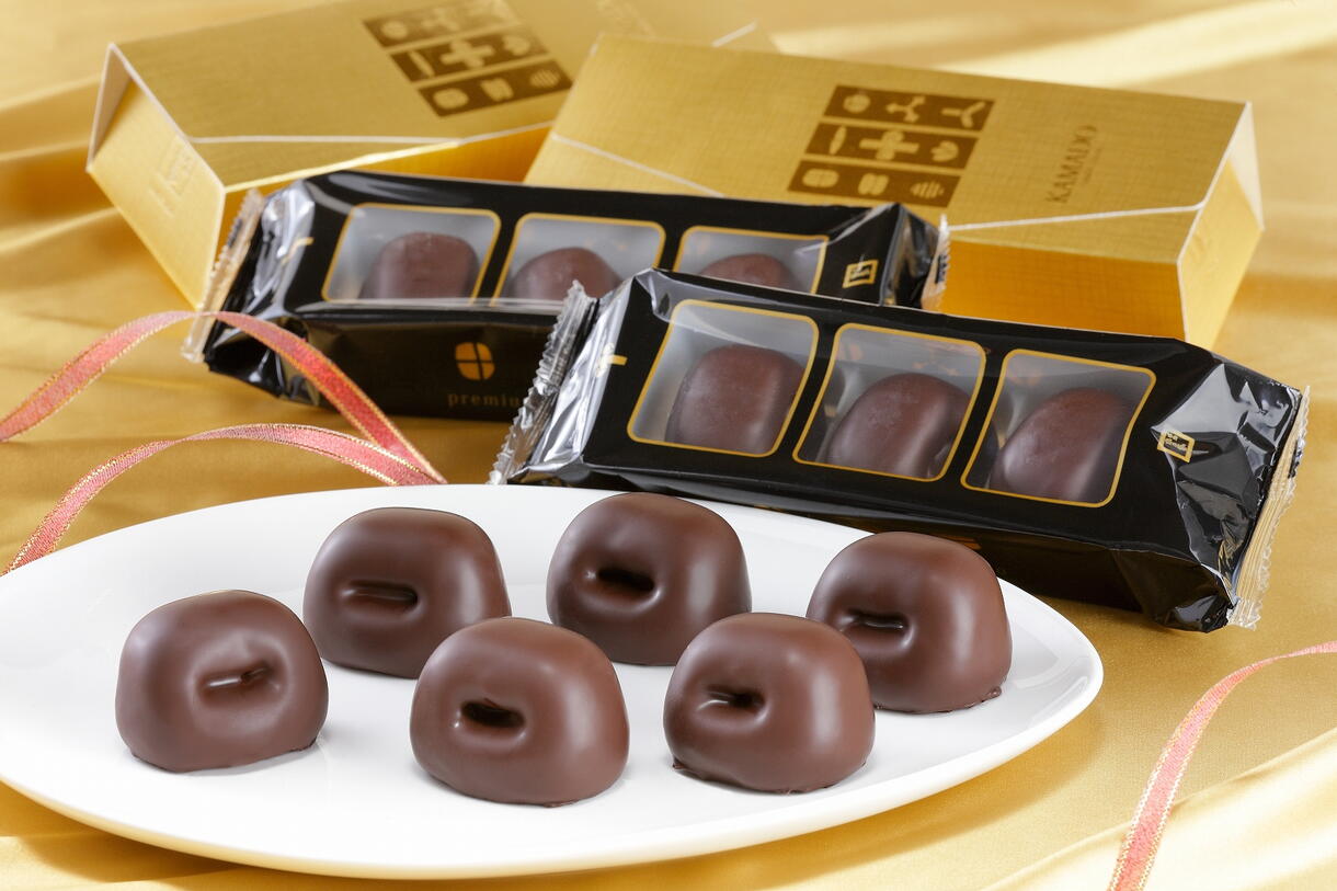プレミアム感満載!人気の“チョコかまど‘‘に厳選したダークチョコレートをコーティングしました。