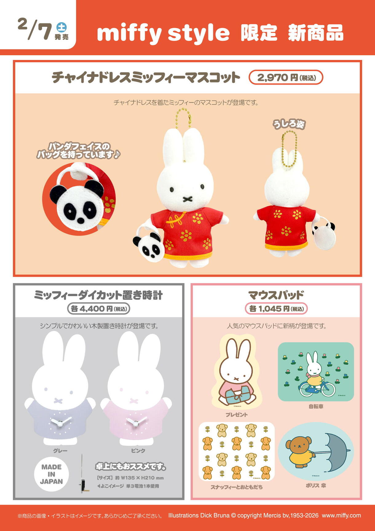 ミッフィースタイル限定のチャイナドレスミッフィーマスコットや新生活に役立つ置時計やマウスパッドが新登場!