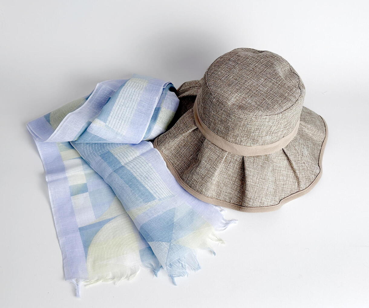 涼やかな麻のストールと帽子で
