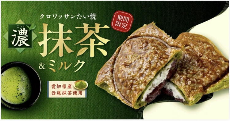 クロワッサンたい焼の新作『抹茶&ミルク』は、希少価値の高まる中、愛知県産 “西尾抹茶” を使用した生地で、焼き上げた瞬間に広がる香ばしさと抹茶の奥深い香りが特長です。今回、中には北海道牛乳を100%使用したコクのある “ミルククリーム” 、さらに口どけのよい北海道産あずきの“自家製餡”に加え、まろやかな味わいの茶葉を挟み込み、より深く、濃い “茶葉” の風味を感じていただける、抹茶好きの方にこそ味わっていただきたい一品です。