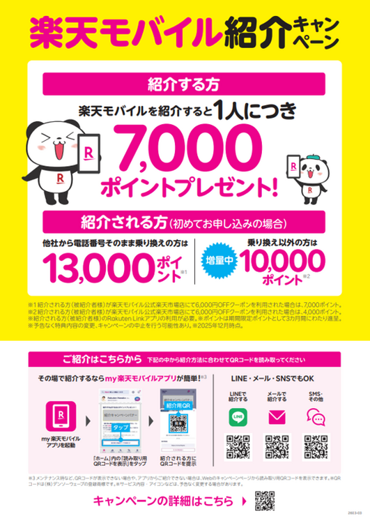 楽天モバイル紹介キャンペーンでは、紹介する方へ7000ポイント、紹介される方へ初め
