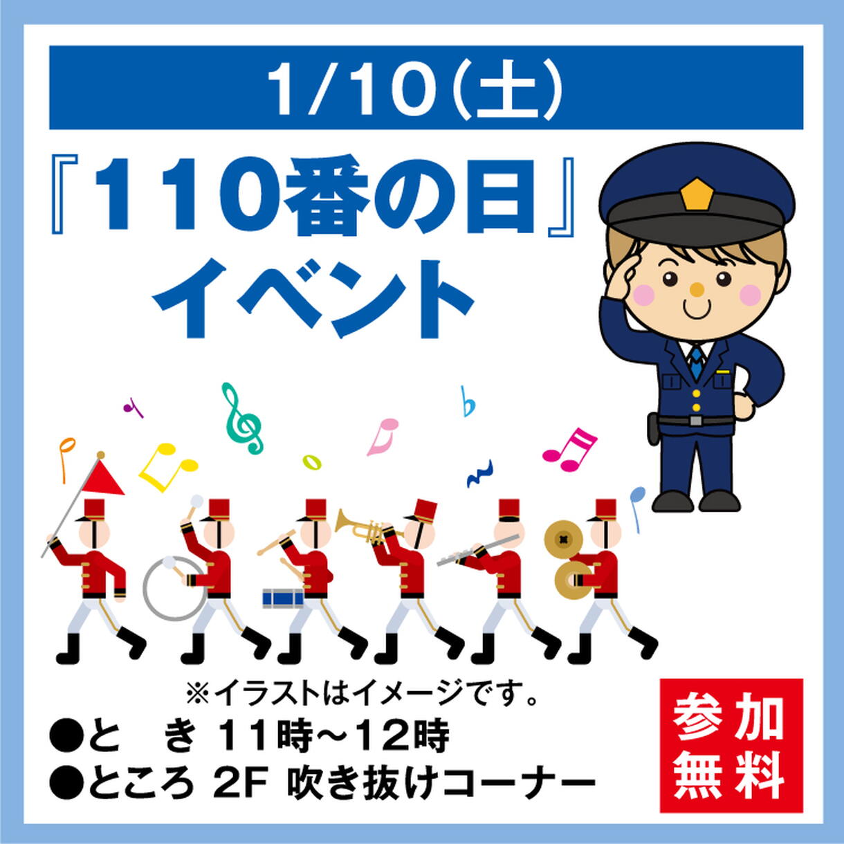 警察官による、正しい110番のかけ方の説明や警察音楽隊による演奏をします。