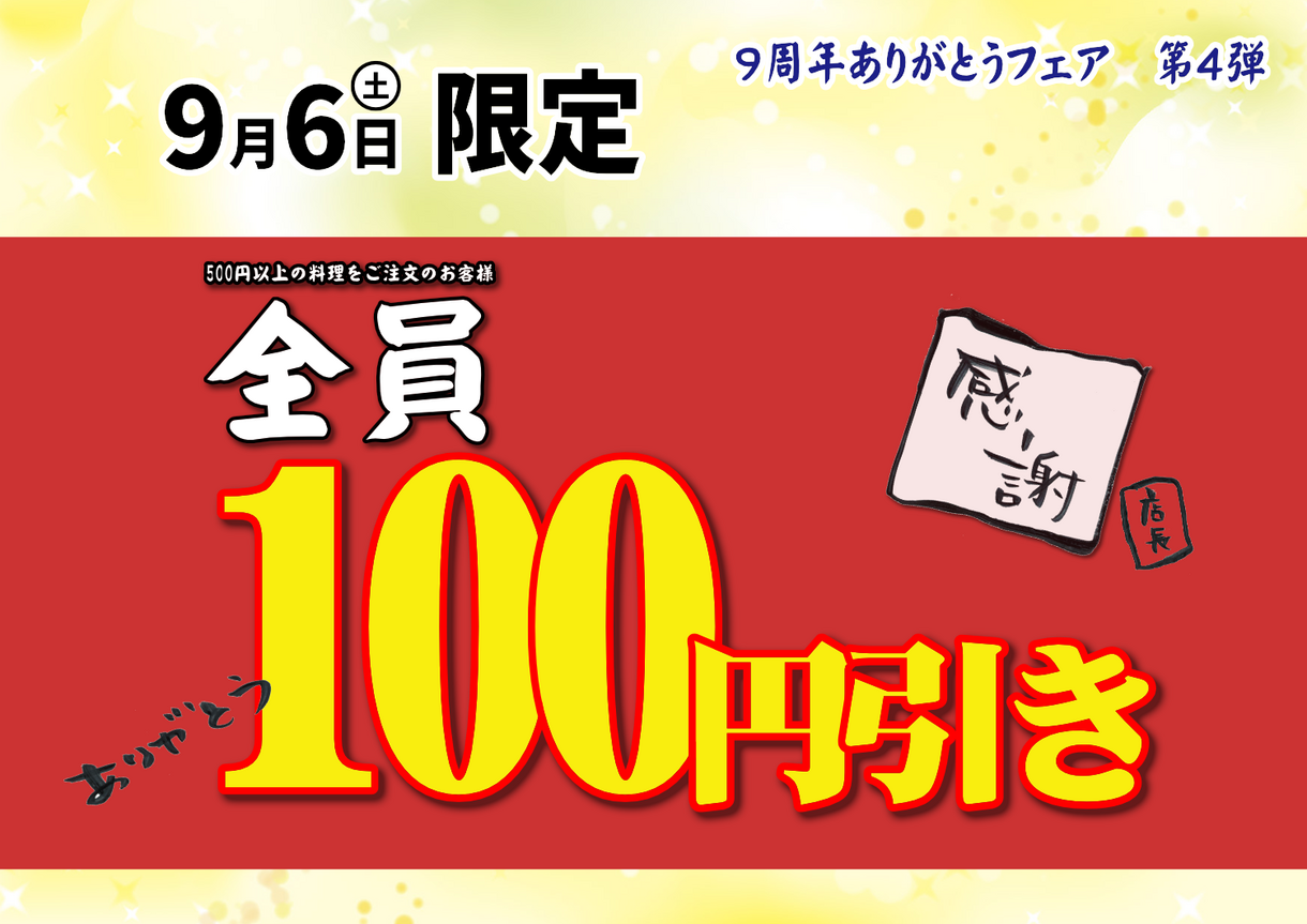 ◎第4弾「当日限定全員100円引き」【期日9/6】