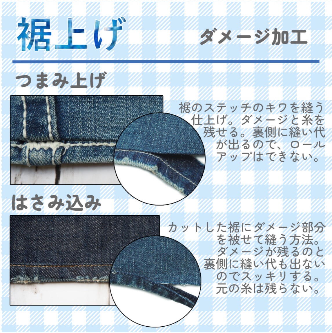 ダメージ裾に加工を施したジーンズをただそのまま丈詰めしてしまうと、せっかくの加工部分がばっさりカットされてしまいます。