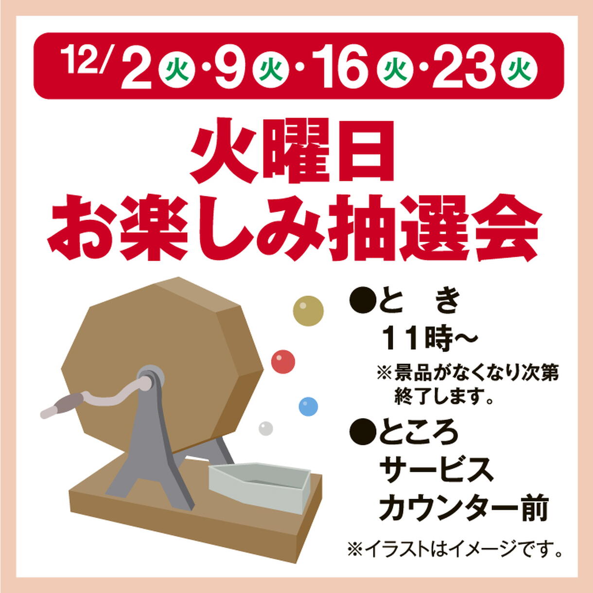 ※12/30(火)の火曜日抽選会はお休みさせていただきます。 1月は1/6(火)から開催を予定しております。