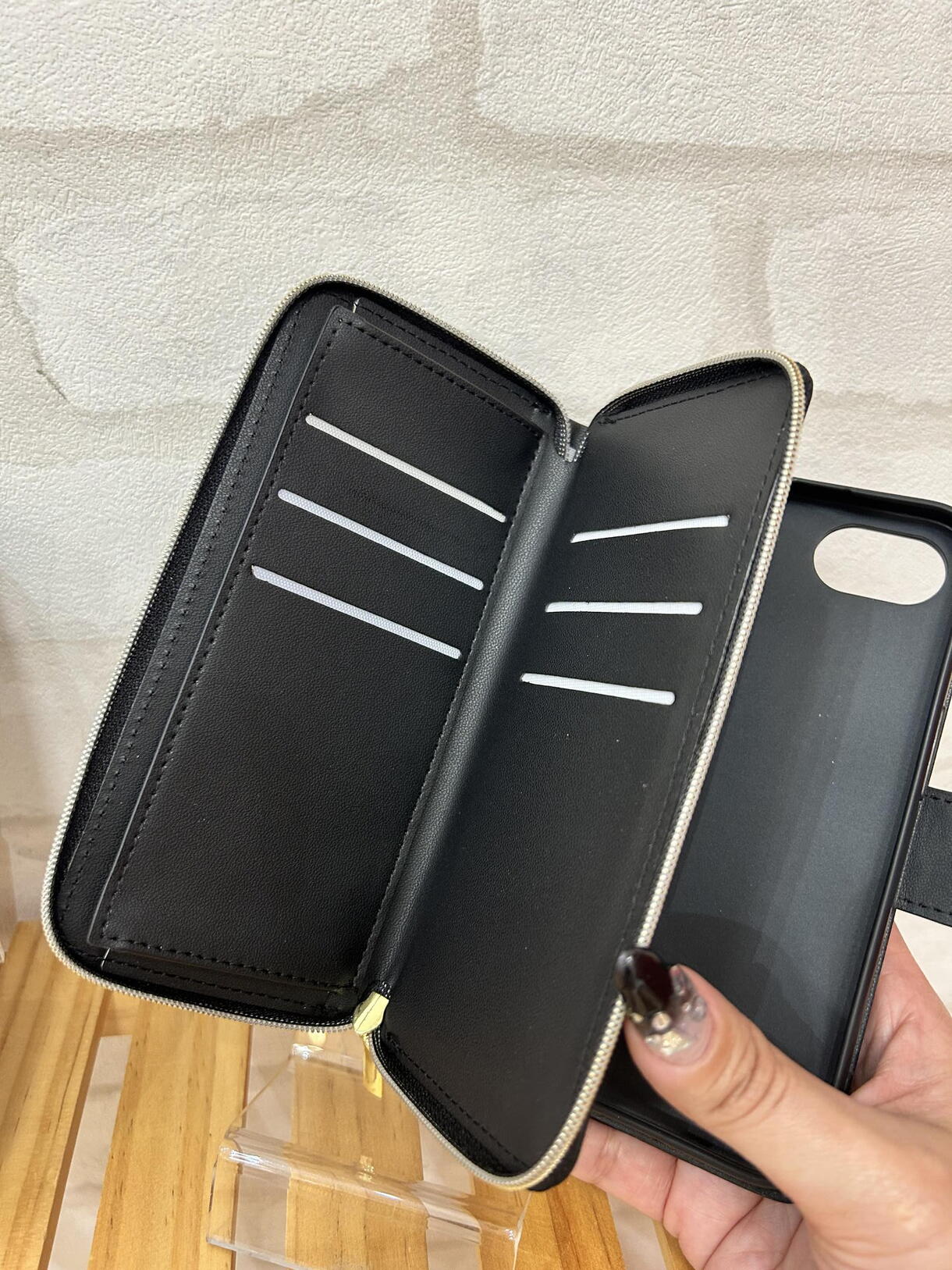 チャックポケットが付いた手帳型ケースは、メモやお金も入り、カードも沢山収納出来るケースです。使い方いろいろ♪