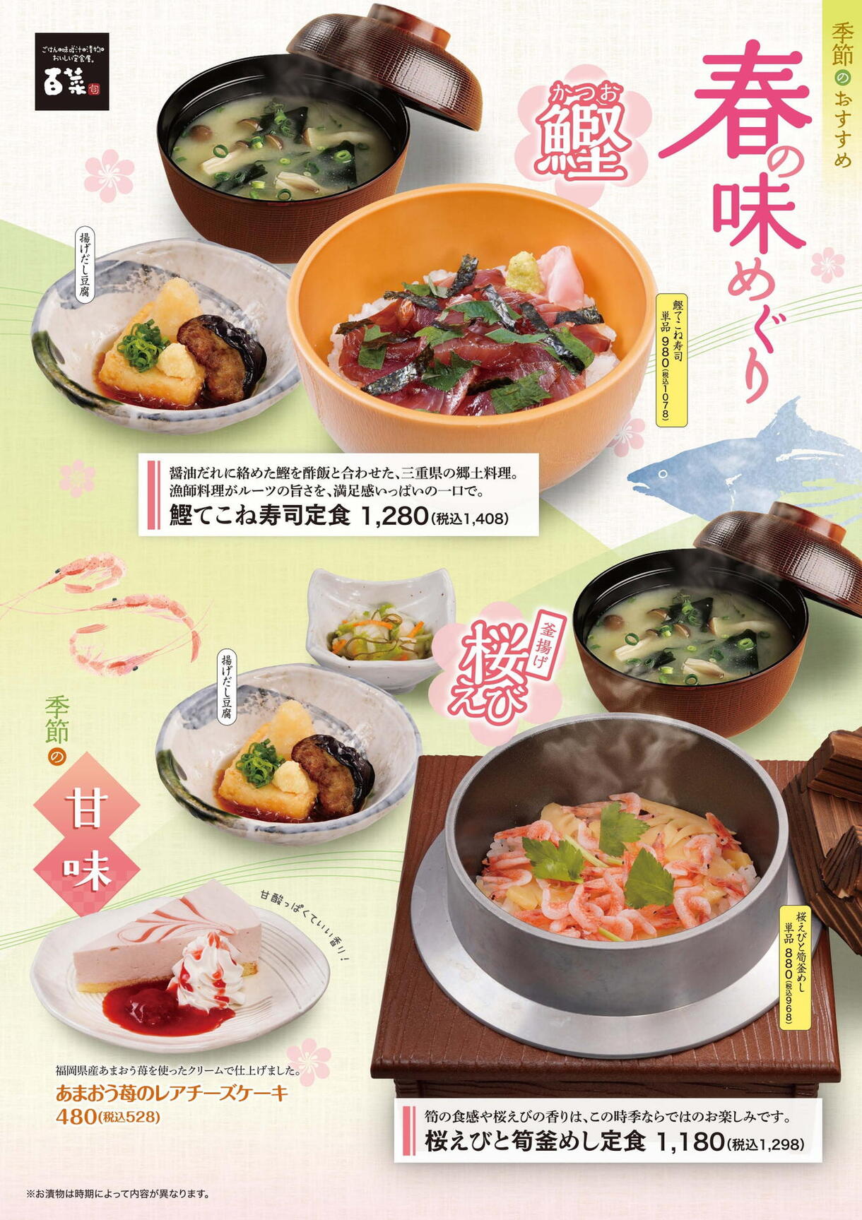 漁師料理がルーツの三重県の郷土料理「鰹てこね寿司」や春らしい風味と食感を味わえる「桜海老と筍の釜めし」をお楽しみください!あまおう苺のレアチーズケーキもおすすめです!この機会に是非ご賞味ください!