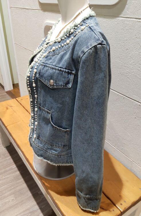 パールデザインがアクセントになった、大人のためのきれいめデニムジャケットです。