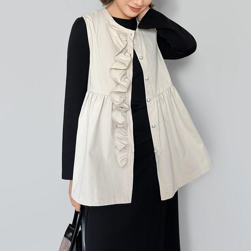 甘さを抑えたフリルデザインと、腰まわりをさりげなくカバーする立体的なシルエットで、きちんと感と女性らしさを両立。