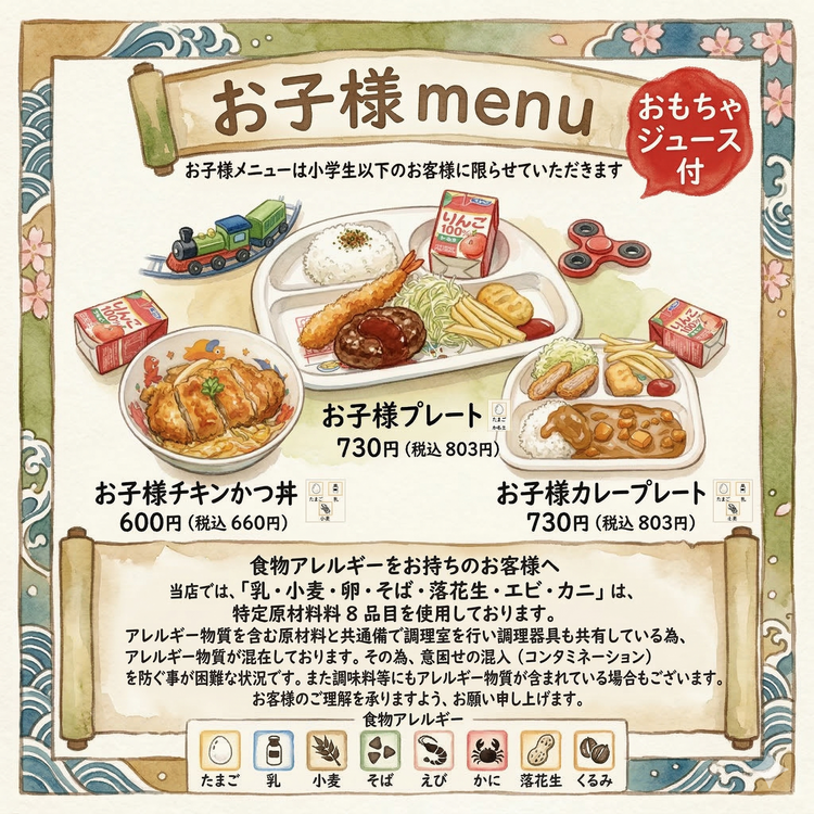 - お子様プレート、お子様カレー、お子様チキンカツ丼