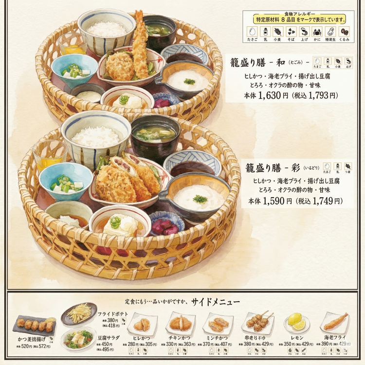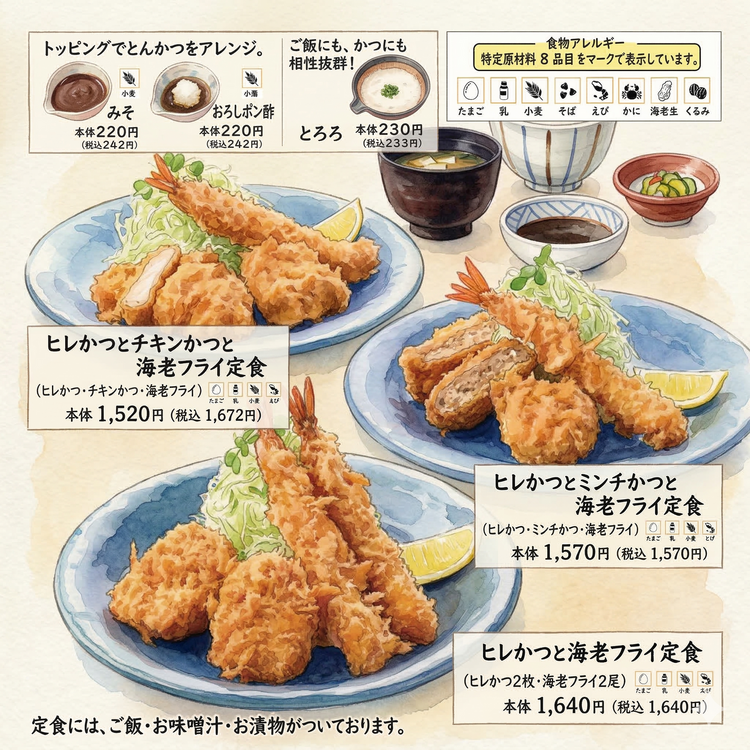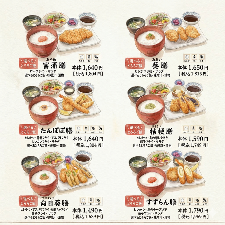 ロースかつ膳、ヒレかつ膳、とろろ膳、海老フライ膳など各種とんかつ定食をご用意。丼メニューやお子様膳、季節限定メニューも取り揃えています。