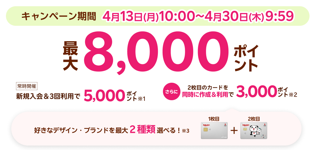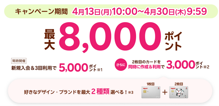 楽天カード新規入会&3回利用で5,000ポイント、さらに2枚目のカードを同時に作成&利用で3,000ポイント、最大8000ポイント還元のオトクなキャンペーンを開催中!※