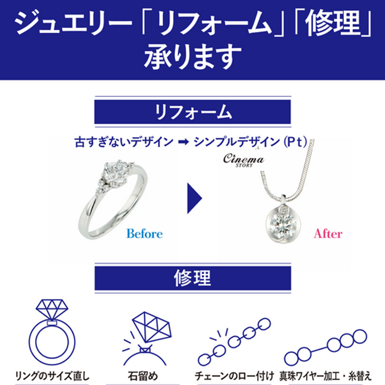 宝石/ジュエリー/アクセサリー/ネックレス/ブレスレット/リング/ブライダルリング/真珠/ダイヤモンド/リフォーム/修理/ディズニー/コスメ