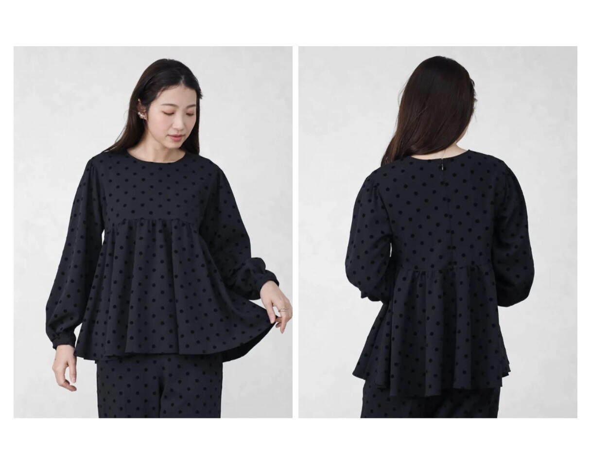 上質感のあるフロッキードット生地が魅力のペプラムブラウス。