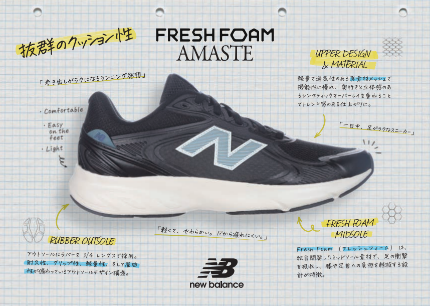 足裏への衝撃を和らげ、ストレスフリーな履き心地を提供する「Fresh Foam Amaste v1」にシーズナルカラーが登場。